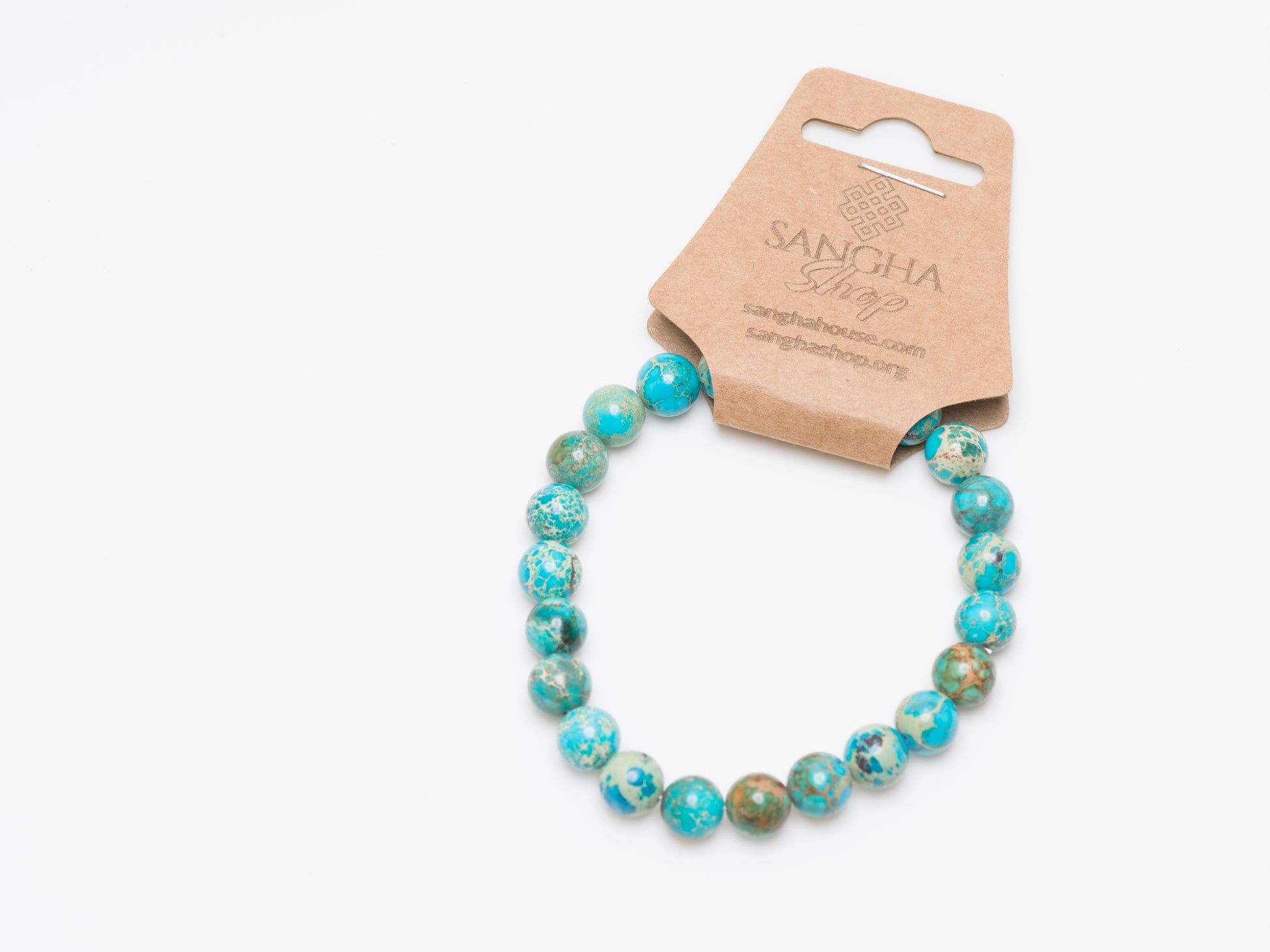 Handmade at Sangha House, this Tibetan Turquoise Mala Bracelet features authentic turquoise beads revered for their protective and healing qualities. Crafted to enhance meditation and mindfulness, the bracelet combines traditional craftsmanship with meaningful symbolism. Its elegant design offers both spiritual significance and everyday wearability.