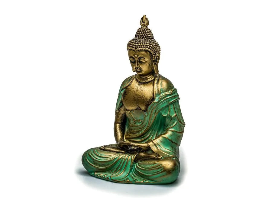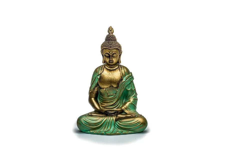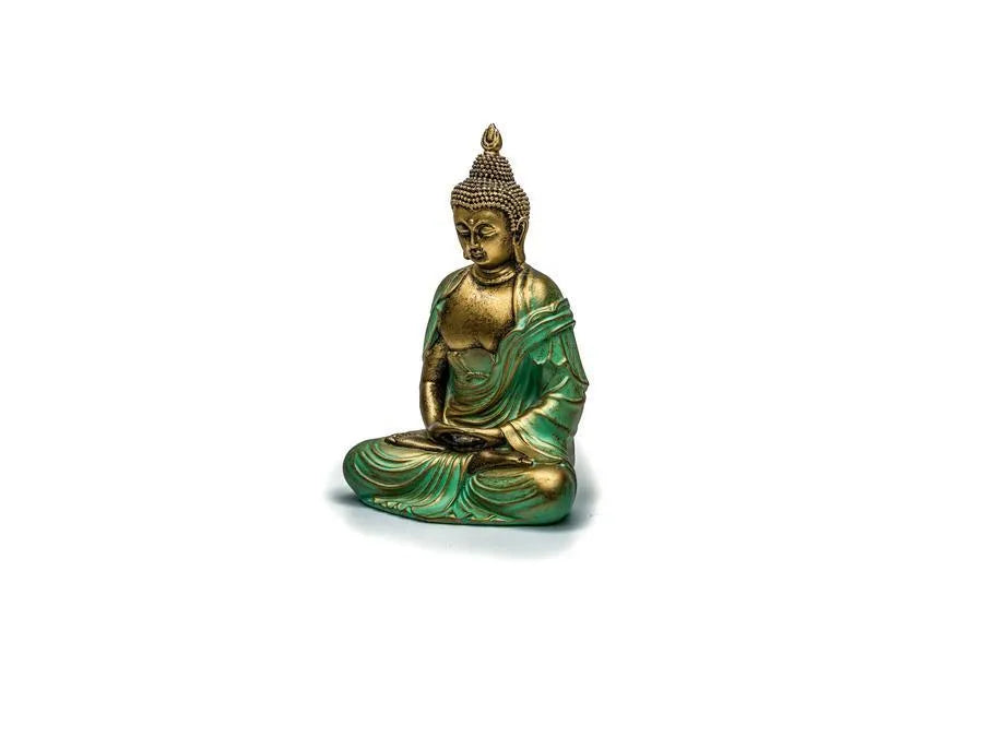 Each statue is carefully molded and hand-painted in gold and turquoise tones, symbolizing enlightenment and healing energy. The aged patina finish evokes a sense of sacred history — as if it has lived in a monastery for centuries — bringing a touch of the sacred into your daily life.