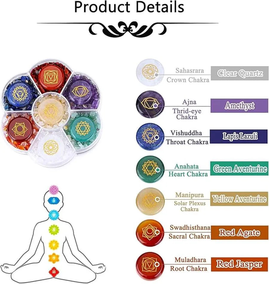 Elevate your spiritual practice and enhance your energy balance with our Chakra Stones Set, crafted from natural quartz crystal and gemstones. This versatile set is perfect for energy balancing, meditation, crystal therapy, Reiki healing, crystal grids, and even witchcraft practices. Each stone is carefully selected to connect with your chakras, helping to raise your vibration and emit a positive flow of energy, making a profound impact on both your physical and mental well-being. Chakra Crystal Connection: The human body is believed to have a fine energy structure, with energy centers known as Chakras, derived from the Sanskrit word for "wheel" or "circle." Each gemstone in this set is spiritually connected to a specific chakra, designed to raise your vibration and encourage positive energy flow. These stones are perfect for aligning your chakras, fostering balance, and promoting overall harmony in your life. Perfect Gift: This natural chakra crystal stone set is an ideal gift for anyone interested in energy healing, crystal therapy, or spiritual growth. Whether you're gifting it to a beginner exploring the world of healing crystals, a yoga enthusiast, or a seasoned crystal gemstone collector, this set will help focus energy, activate and clear chakras, and bring about balance, happiness, love, and luck. Specifications: Tumbled Chakra Stones: Each stone measures approximately 0.98-1.02 inches, perfect for holding during meditation or placing on the body during healing sessions. Chakra Stones Included: The set features seven natural chakra crystals: Amethyst, Clear Quartz, Lapis Lazuli, Green Aventurine, Yellow Aventurine, Red Agate, and Red Jasper. Storage Box: This compact plastic box measures 3.94 inches in length and width and is ideal for keeping your stones safe and organized. Total Weight: 155g Package Includes: 1x Chakra Crystal Stone Set Enhance your spiritual journey with this Chakra Stones Set, and let the natural energy of these crystals bring balance and positive energy into your life.