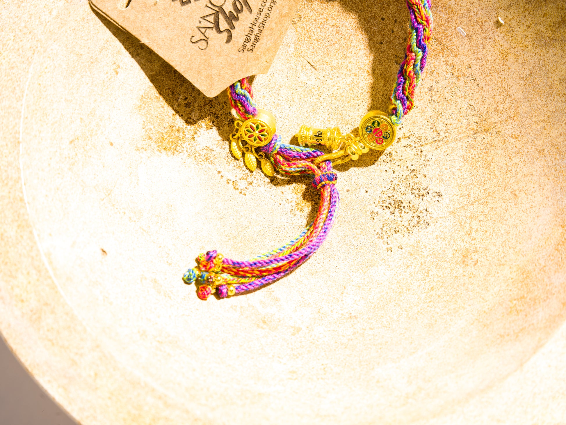 Bright, bold, and full of blessing — our Tibetan Woven Bracelet is a handmade symbol of protection, luck, and compassion. Each bracelet is woven by Tibetan artisans using a blend of vibrant, multicolored threads, representing the interconnection of all beings and the harmony of the five elements.